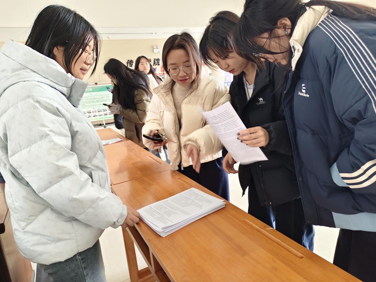 大课间,提前知讯的同学们来到现场,工作人员一边询问“四级还是六级试题”?一边根据需求把试题送到同学们手中,同时指出在“图书馆公众号-数字资源-起点考试网-四六级模拟试题”上提交可以检测对错,并有详细解析;除了线下发放,各位辅导员让同学们拍上“起点考试网”模拟试题路径宣传册,发往同学群,让未能到场的同学也可自行下载使用,确保惠及每一位有需要的学子。各位老师亲切地叮嘱大家要科学规划复习时间,注意劳逸结合,以最佳状态迎接即将到来的考试。