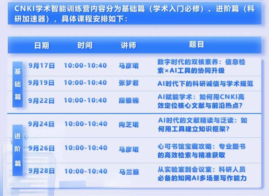 一、活动内容:基于知网学术大讲堂开展开学季系列课程,内容分为基础篇(学术入门必修)、进阶篇(科研加速器)。