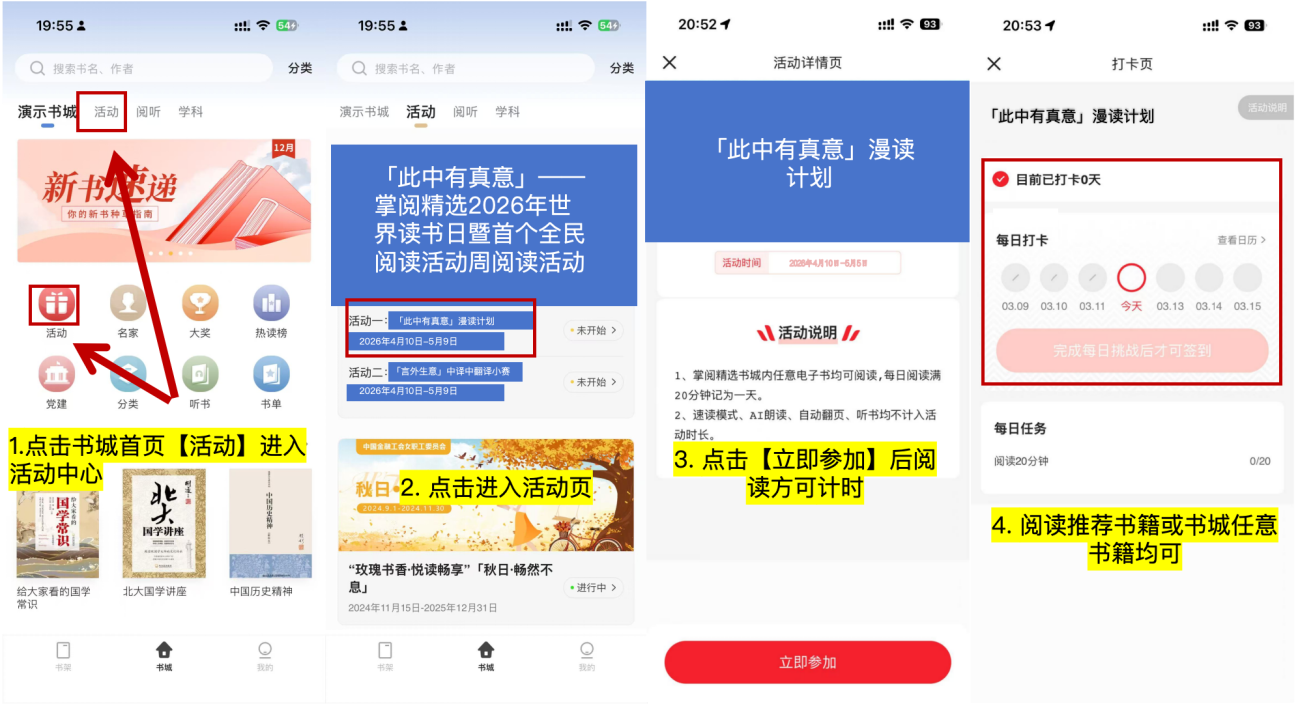 阅读推荐书单或掌阅精选书城内任意电子书,每日阅读满20分钟即可。