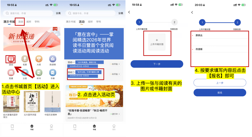 (2)活动期间每人可参与一次,提交时需包含 【原表达】 和 【翻译版】 两部分,翻译字数建议在50-200字,同时上传一张书籍封面图或与阅读有关的图片;