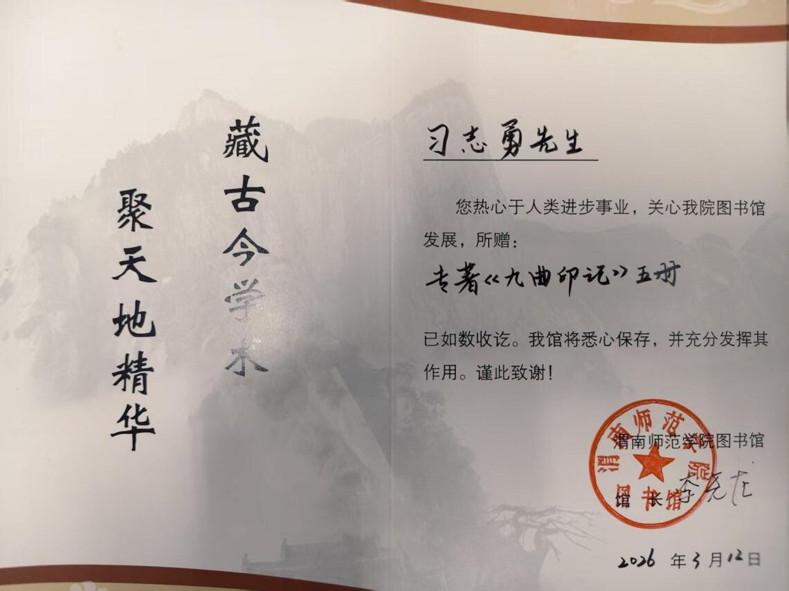 3月12日下午,习志勇先生向图书馆(档案馆)捐赠专著《九曲印记》5册。